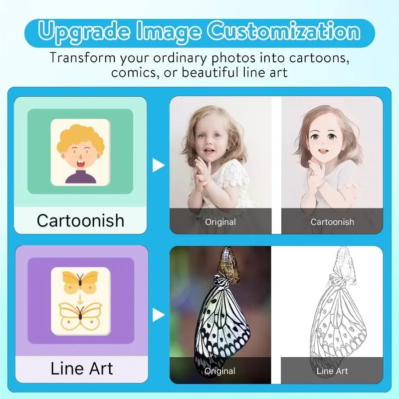 【VERSATILE DESIGN】: Utilize advanced AI technology to generate images based on text descriptions. Just enter the description of the image you desire, and watch as the AI intelligently generates and prints it for you. This pocket printer also supports versatile image customization, transform your ordinary photos into cartoons, comics, or beautiful line art. With the phone printer, printing has never been so fun and imaginative.